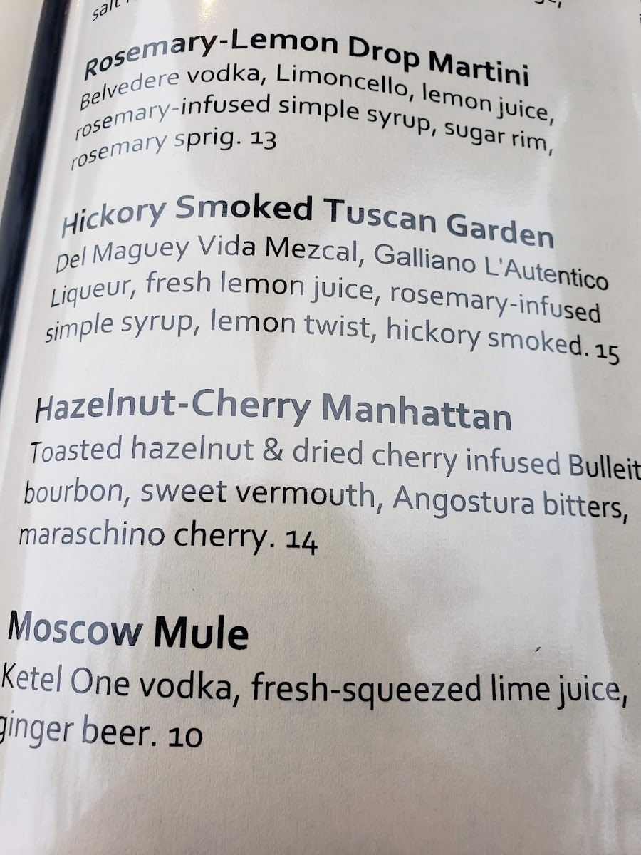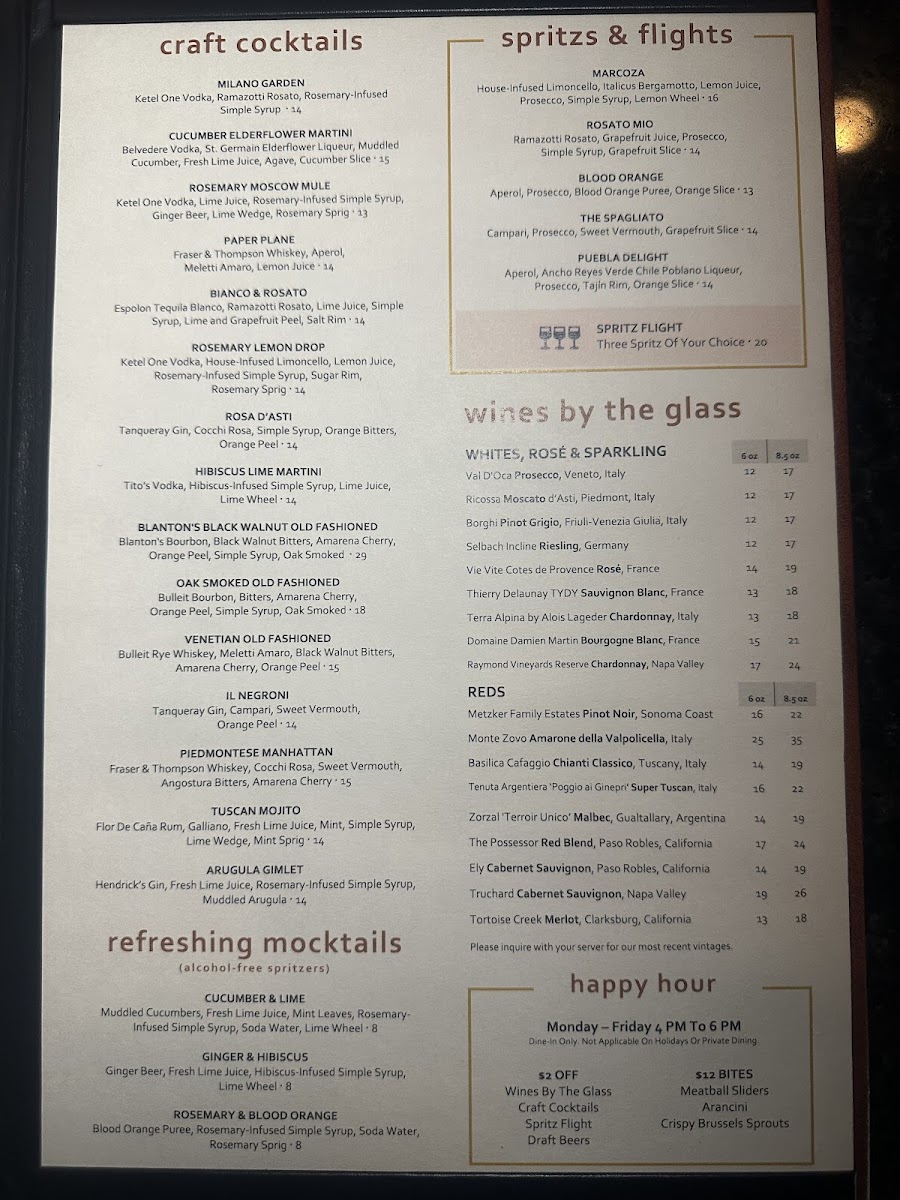 Beverages encompass multiple categories. The wine list includes several wine bottles such as Listel Rosé, Cabernet Sauvignon, Malbec, and Chardonnay, offering variety in reds and whites. Craft cocktails are available, including drinks like the Rosemary Lemon Drop, Il Negroni, Piedmontese Manhattan, and Tuscan Mojito.