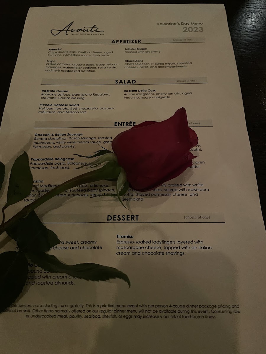 Food options include classic Italian entrees such as lasagna, chicken parmigiana, seafood risotto, and various pasta dishes including linguine with clams and truffle ravioli. Lighter options and appetizers like smoked burrata, mussels in white wine, beef carpaccio, and charcuterie boards are also available. Desserts include traditional Italian sweets such as tiramisu and lava cake.